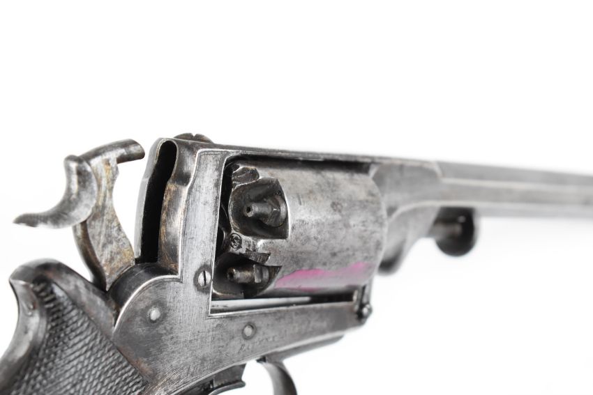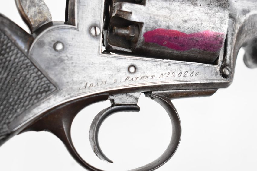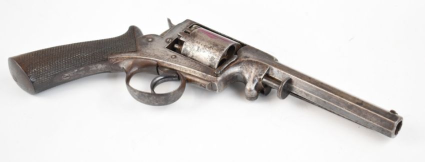 Pirlot Brothers of Liege Belgium Adams Patent 54 bore five shot double-action revolver with chequered grip and 5.75 inch octagonal barrel, overall length 34cm, serial number 20266.