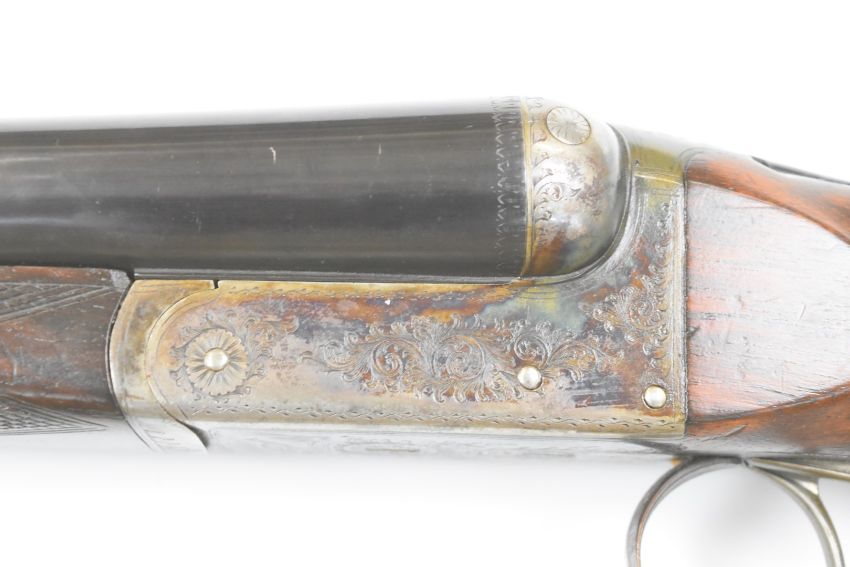 Frederick T Baker 12 bore side by side shotgun with engraved lock, trigger guard, thumb lever, fences and underside, chequered semi-pistol grip and forend, double trigger, vacant cartouche to the underside of the stock and 32 inch barrels choked ¾, overall length 123cm, length of pull 36.5cm, serial number 8754.  PLEASE NOTE THAT A VALID RELEVANT FIREARMS/SHOTGUN CERTIFICATE IS REQUIRED TO HANDLE/PURCHASE THIS ITEM.