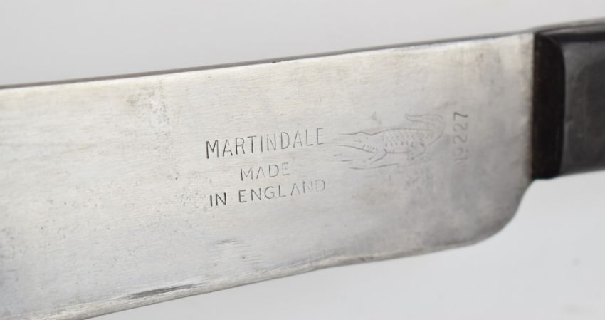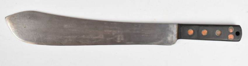 British Army Martindale machete number 227, the 14.5cm  blade marked with broad arrow and KE 8277 dated 1956, with leather sheath. PLEASE NOTE ALL BLADED ITEMS ARE SUBJECT TO OVER 18 CHECK ON COLLECTION OR DELIVERY