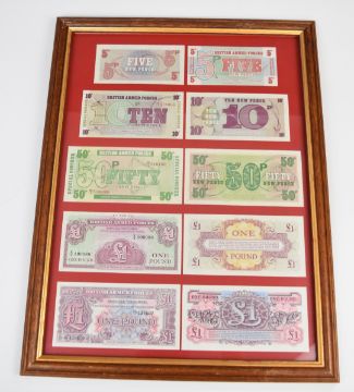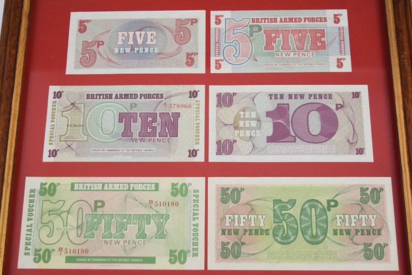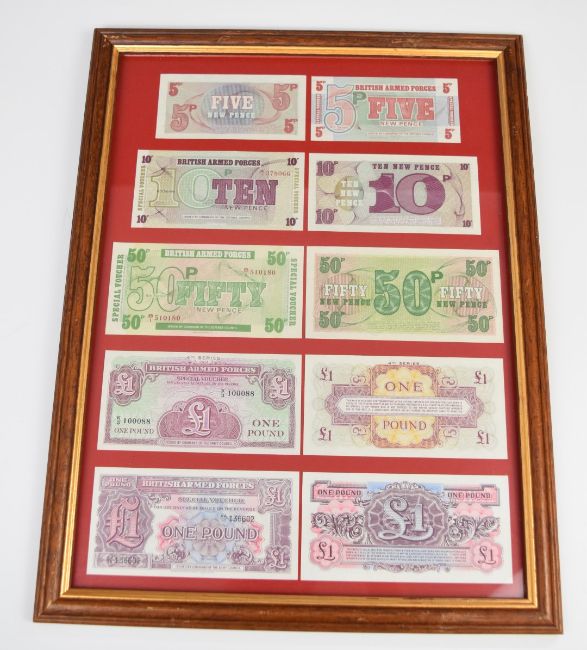 Ten British Armed Forces Special Vouchers including 5p, 10p, 50p and £1 examples, in glazed display, 34 x 17.5cm