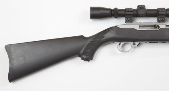 Ruger Model 10/22 .22 semi-automatic rifle with chequered semi-pistol grip and forend, composite stock, Leupold VX1 3-9x40 scope, sound moderator and 25 inch barrel, overall length 110.5cm, serial number 258-03440.  PLEASE NOTE THAT A VALID RELEVANT FIREARMS/SHOTGUN CERTIFICATE IS REQUIRED TO HANDLE/PURCHASE THIS ITEM.