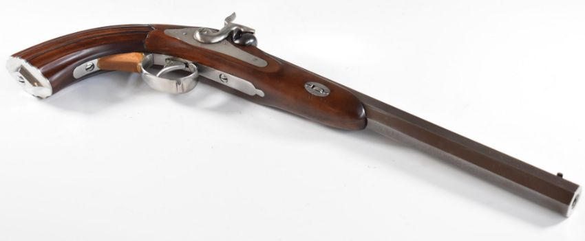 Pedersoli Mang In Graz .36 percussion hammer action pistol with adjustable trigger, carved grip, shaped butt cap and named 11 inch rifled octagonal barrel, overall length 44cm, serial number MG1500. PLEASE NOTE THAT A VALID RELEVANT FIREARMS/SHOTGUN CERTIFICATE IS REQUIRED TO HANDLE/PURCHASE THIS ITEM.