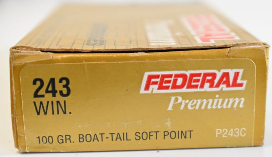Eight .243 Win Federal rifle cartridges, in original box PLEASE NOTE THAT A VALID RELEVANT FIREARMS/SHOTGUN CERTIFICATE IS REQUIRED TO HANDLE/PURCHASE THIS ITEM. Please note we are not able to offer postage for this lot.