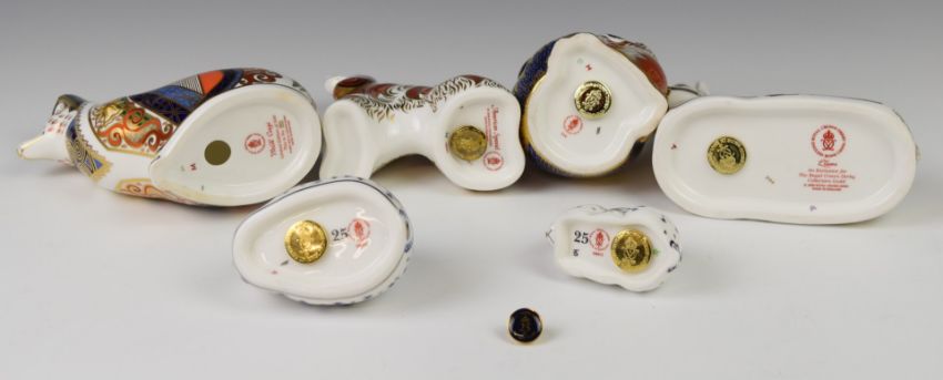 Five Royal Crown Derby paperweights in boxes, including American Spaniel, Llama and Welsh Corgi