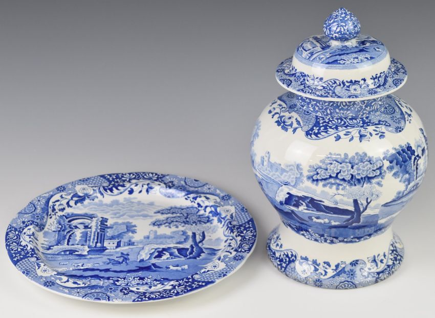 Spode Italian pattern covered ginger jar and charger, diameter 31cm x height 34cm