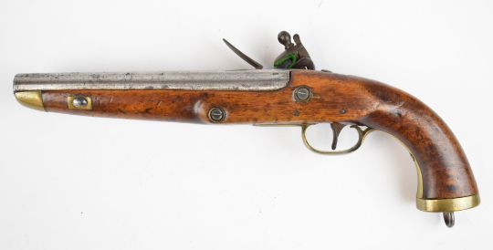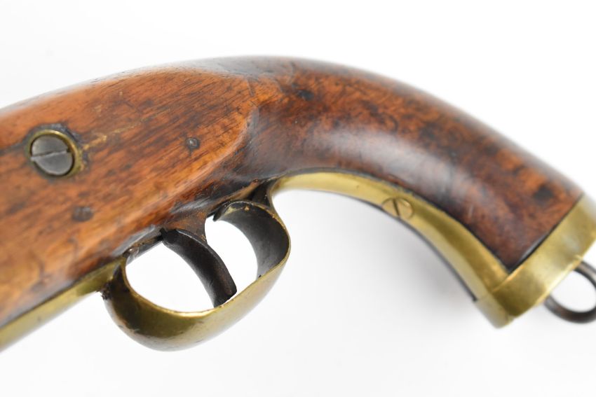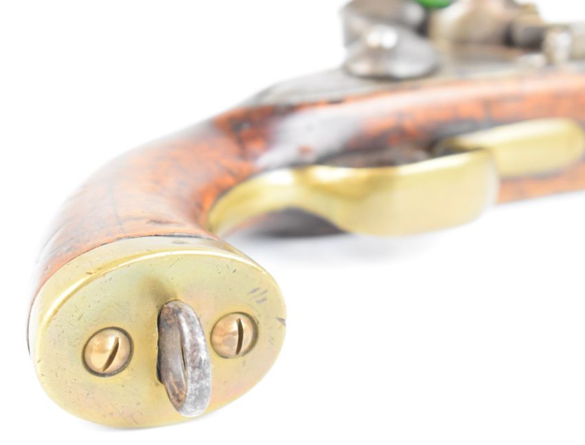 16 bore flintlock hammer action Sea Service pistol with brass butt plate, trigger guard and mounts, belt loop and 9 inch smooth bored barrel, overall length 41cm.