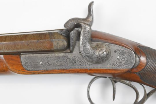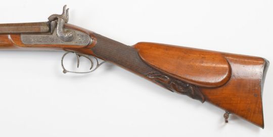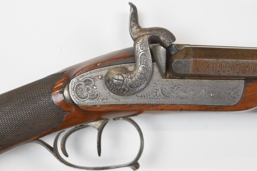 Beuret Frères of Liege Belgium double barrelled side by side percussion hammer action sporting gun with engraved locks, hammers, trigger guard, butt plate and mounts, chequered grip carved in the form of a boar's head, raised cheek piece, sling suspension loops, brass tipped wooden ram-rod and 33 inch smooth bored Damascus barrels inlaid in gold 'Damas Anglais', overall length 123cm.