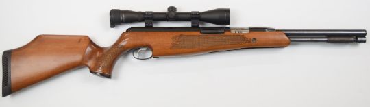 Air Arms TX200 .22 under-lever air rifle with chequered semi-pistol grip and forend, adjustable trigger, raised cheek piece and Marchwood 4x40 scope, serial number 080156.