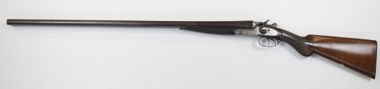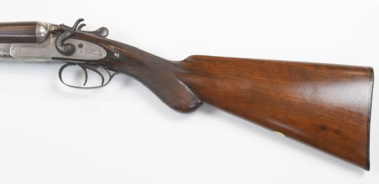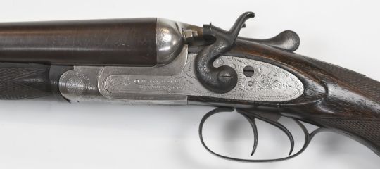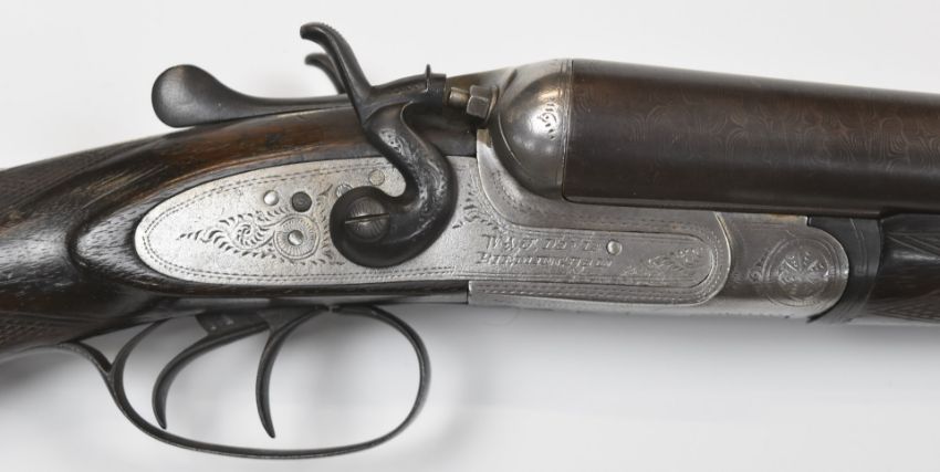 W&J Davies 12 bore side by side hammer action shotgun with named and engraved lock, chequered semi-pistol grip and horn tipped forend, vacant cartouche to the underside of the stock, double trigger and 31.75 inch barrels choked ¾ and ½, overall length 122cm, length of pull 35.5cm, serial number 97241. PLEASE NOTE THAT A VALID RELEVANT FIREARMS/SHOTGUN CERTIFICATE IS REQUIRED TO HANDLE/PURCHASE THIS ITEM.