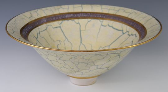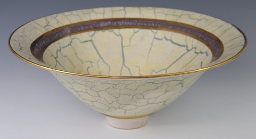 Tony Laverick studio pottery pedestal bowl with crackle glaze style decoration, diameter 43cm