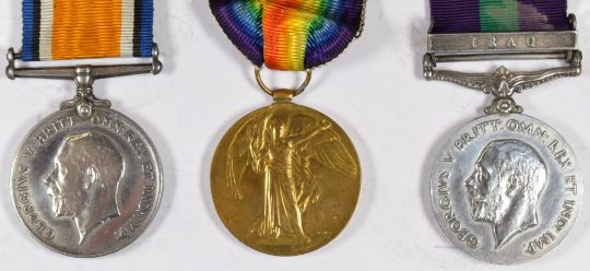British Army WW1 medal pair comprising War Medal and Victory Medal named to 193438 Pte G E Woodward, Army Service Corps, together with a General Service Medal with clasp for Iraq named to 193438 A/Cpl Woodward, Royal Army Service Corps