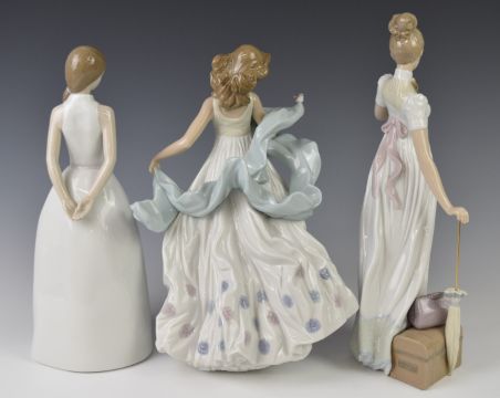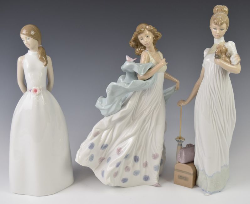 Three Lladro figurines including girl with parasol and a girl with a bird on her shawl, tallest 32cm