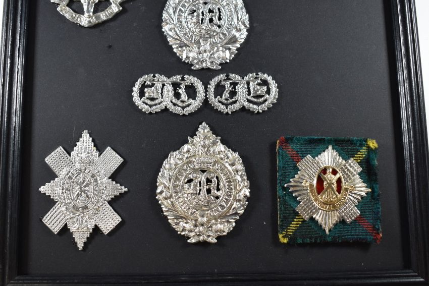 Mounted display of British Army Scottish Regiment badges including Royal Scots and King's Own Scottish Borderers The badges have not been removed for inspection/verification, so may include copies or restrikes