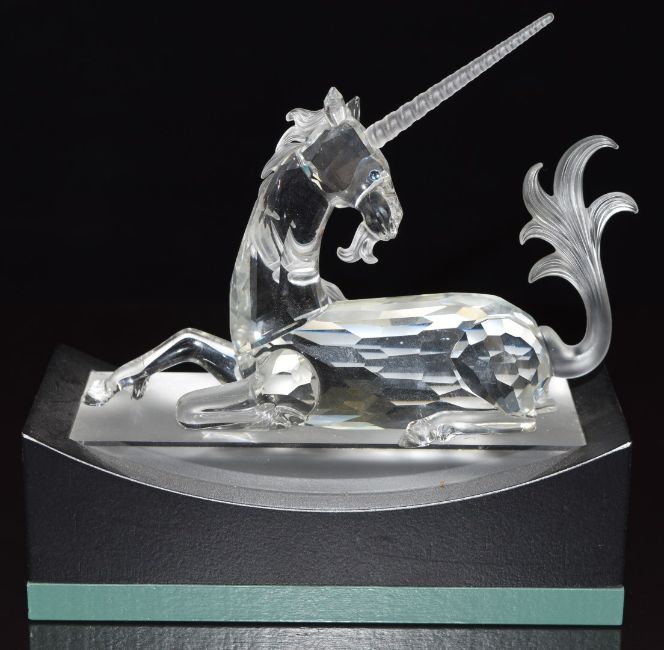 Two Swarovski Crystal glass animals dragon and uniform, both on display plinths, each base 15cm long.