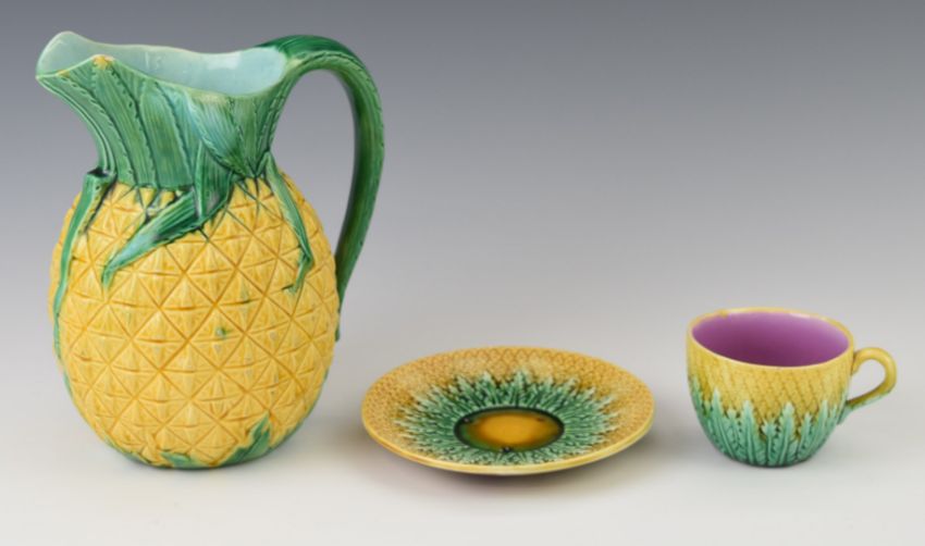 19thC majolica jug and a cup and saucer, tallest 20cm