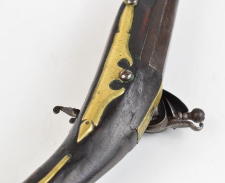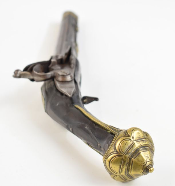 Continental flintlock duelling or similar pistol with engraved lock and hammer, engraved brass butt cap, top plate and mounts, brass tipped wooden ram-rod and 11.75 inch smooth bored barrel, overall length 50cm.