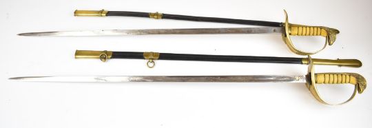Two replica RAF senior officer's swords with eagle head pommel and cypher to hilt, longest blade 83cm, both with scabbards. PLEASE NOTE ALL BLADED ITEMS ARE SUBJECT TO OVER 18 CHECK ON COLLECTION OR DELIVERY