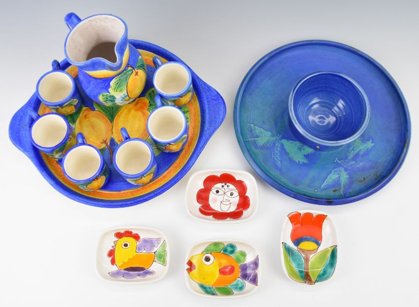 Desimone four Italian pin trays and a Spanish pottery jug and cup set
