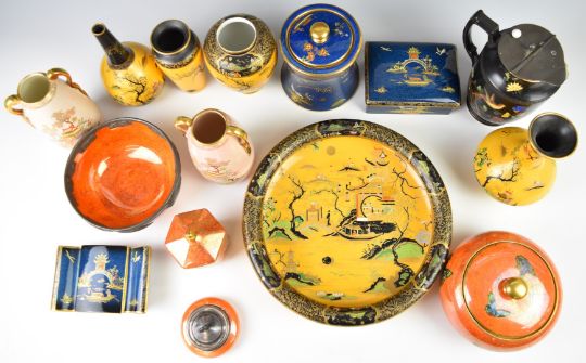 Carltonware lustre vases, bowls and covered pot decorated with fish, butterflies etc and a 'Carlton Cloisonné Ware' jug, tallest 31cm