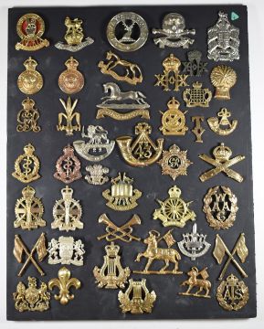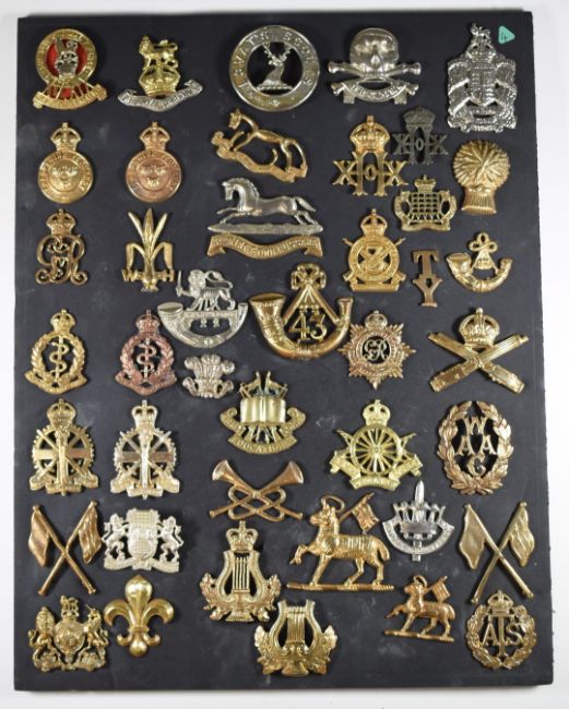 Mounted display of approximately 40 British Army metal badges including Royal Gloucestershire Hussars, Westminster Dragoons, Welsh Horse, 20th Hussars, Berkshire Regiment, Light Infantry etc The badges have not been removed for inspection/verification, so may include copies or restrikes