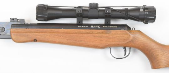 Webley Hawk .177 air rifle with semi-pistol grip, raised cheek piece and Nikko Stirling Mountmaster 4x32 scope, serial number 18978.