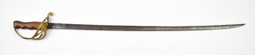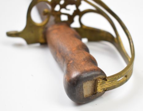 Continental sword with wooden grip, Gothic style hilt with East India Company motif and 74cm curved pipe back blade. PLEASE NOTE ALL BLADED ITEMS ARE SUBJECT TO OVER 18 CHECK ON COLLECTION OR DELIVERY