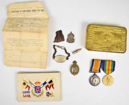 British Army WW1 medal pair comprising War Medal and Victory Medal named to 226458 Driver S M Lowe, Royal Artillery, together with Princess Mary's Christmas tin, silk postcards, letter, a piece of shrapnel and spent bullet, identity bracelet etc