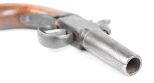 Unnamed percussion hammer action pocket pistol with engraved lock, vacant wrist cartouche and 2 inch smooth bored turn off barrel, overall length 16cm.