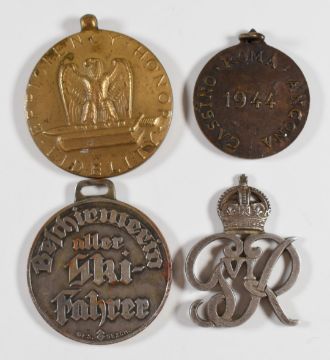 A small collection of medallions and badges including, the Civil Defense Corps, Gaunt London with 'Free French' on the reverse, Tanks Corps silver badge, 'V for Victory' engraved and silver badge etc