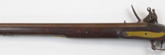 East India Trading Company flintlock musket with lock stamped '1810' and with lion trademark, brass trigger guard, butt plate and mounts, steel ram-rod, fixed alignment sights, sling suspension loops and 33 inch smooth bored barrel, overall length 125cm