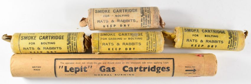 Five rat and rabbit smoking cartridges including The Tradoc and Lepit Gas Cartridges. Please note we are not able to offer postage for this lot.