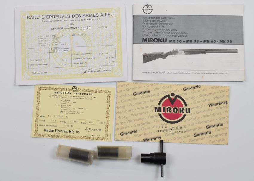 Miroku MK-70 12 bore over and under ejector shotgun with engraved locks, thumb lever and underside, chequered semi-pistol grip and forend, single trigger, vented top rib and 30 inch multi-choke barrels, overall length 120cm, length of pull 37cm, serial number 75363MX, with two additional chokes, choke key and related paperwork.  PLEASE NOTE THAT A VALID RELEVANT FIREARMS/SHOTGUN CERTIFICATE IS REQUIRED TO HANDLE/PURCHASE THIS ITEM.