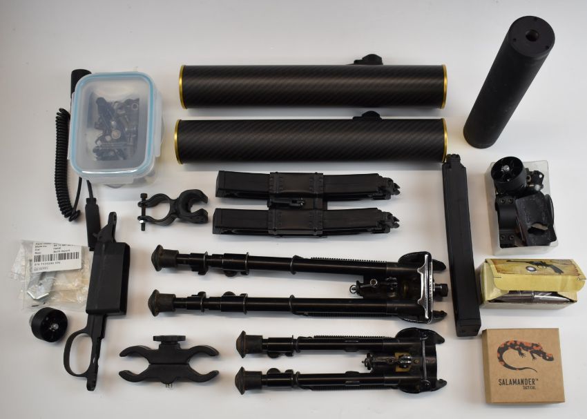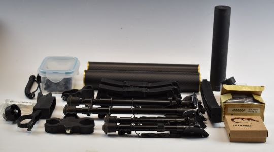A collection of gun and rifle parts including Parker-Hale peep hole sights, ladder sights, air rifle sound moderators, bi-pods, scope mounts etc.