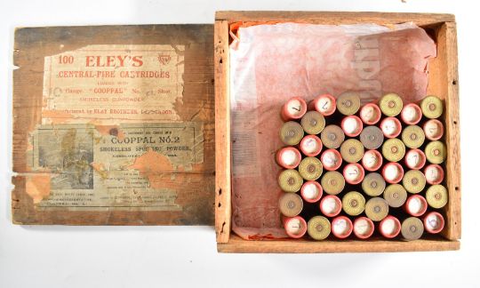 Forty six Eley 10 bore shotgun cartridges, in original wooden packing case marked Cooppal No4 PLEASE NOTE THAT A VALID RELEVANT FIREARMS/SHOTGUN CERTIFICATE IS REQUIRED TO HANDLE/PURCHASE THIS ITEM. Please note we are not able to offer postage for this lot.