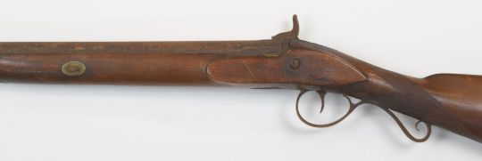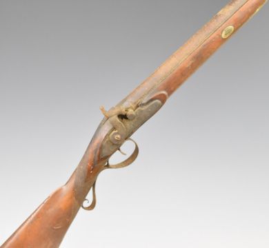 Unnamed private purchase percussion hammer action sporting gun with chequered grip, scrolling trigger guard, wooden ram-rod and 34 inch smooth bored barrel, overall length 128cm.