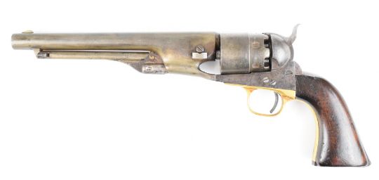 Colt 1860 Army .44 six-shot single action revolver with shaped wooden grips brass trigger guard, frame stamped 'Colts Patent', cylinder engraved with scenes of ships and 8 inch barrel stamped 'Address Col Saml Colt New-York US America', overall length 37cm, serial number 58557.