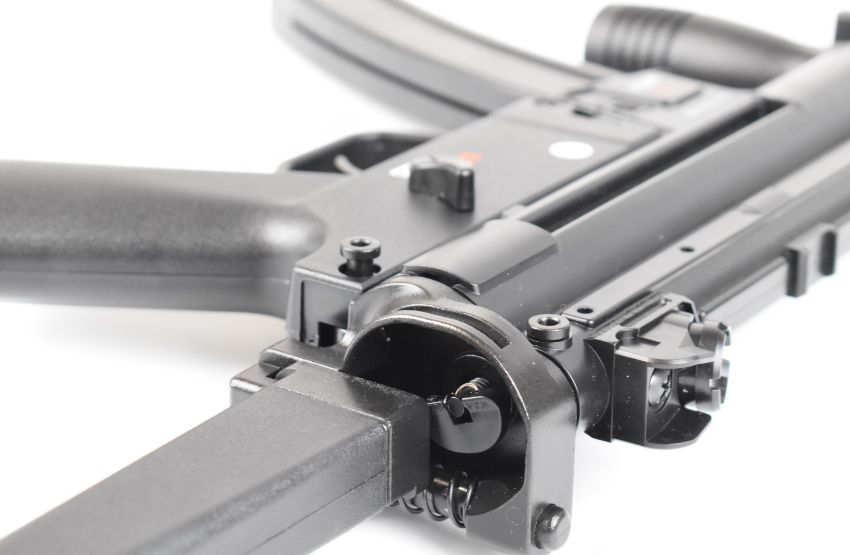 Heckler & Koch MP5K-PDW assault style electric airsoft rifle with folding tactical stock, adjustable sights, scope rail, pistol grip and multi-shot magazine, serial number 15H49702, in original box.