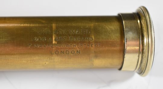 A pair of WW1 era military binoculars and a brown leather cased telescope by J H Steward, London
