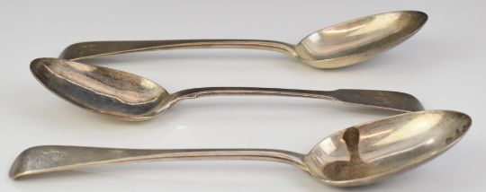 Three William IV and later hallmarked silver table spoons comprising Victorian pair, London 1865, maker Chawner & Co, and a Fiddle pattern example, London 1830, maker's mark rubbed, length of longest 22cm, weight of all three 237g