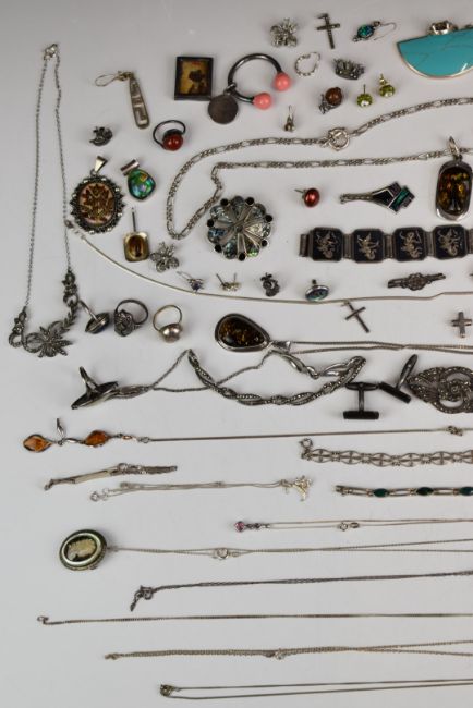 A large collection of silver jewellery including two pairs of cufflinks, eleven pendants set with pressed amber, abalone, mother of pearl cameo, St Christopher, tiger's eye, twelve rings set with cubic zirconia, garnet, rhodochrosite, marcasite, three brooches, two marcasite necklaces, marcasite bracelet, cameo pendant, four bracelets, earrings, bangle etc