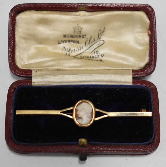 A 9ct gold ring set with sapphires and diamonds (1.5g, size L), 9ct gold brooch set with a cameo (1.5g), two silver watches, eleven mother of pearl counters, silver swivel fob, two silver watch chains etc