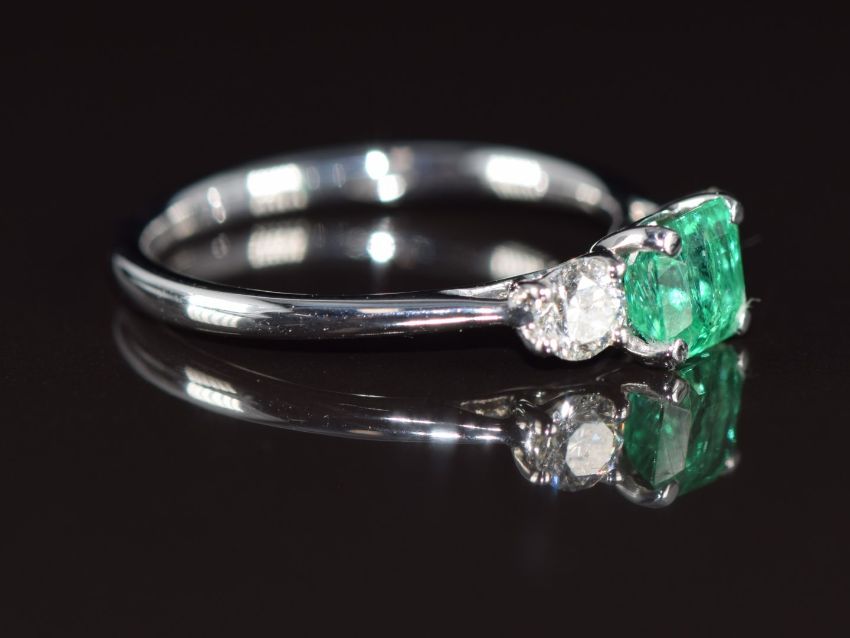 An 18k white gold ring set with an emerald cut emerald of approximately 0.66ct and diamonds totalling approximately 0.37ct, 2.3g, size L