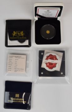 Five miniature and similar proof gold coins comprising 2019 Alderney 24ct 0.5 poppy coin, Platinum Jubilee 24ct 1/200oz, 2022 limited edition (168/1000) East India Company Una & The Lion 9999 0/5g, 2016 585 0.5g Wonders of the Ancient World and 2016 585 0.5g Congo coin