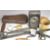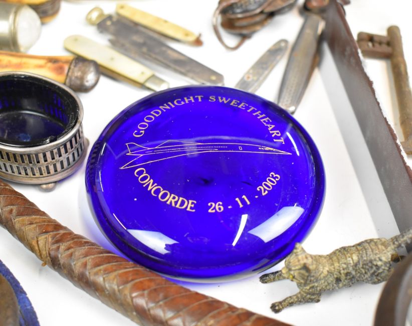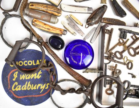 Collectable vintage pocket knives by Joseph Rodgers and George Plum, Bristol, hallmarked silver salt, vintage lamps, cast iron GWR Railway plaque, Markham Traction sign, leg shackles, miniature leather gloves, silver fob watch, cast metal cat, vintage keys, hallmarked silver fruit knife and Russian lacquer box