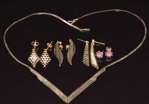 A 9ct gold tri-coloured ribbon necklace and four pairs of 9ct gold earrings, one pair set with a diamond and rubies, 9.9g