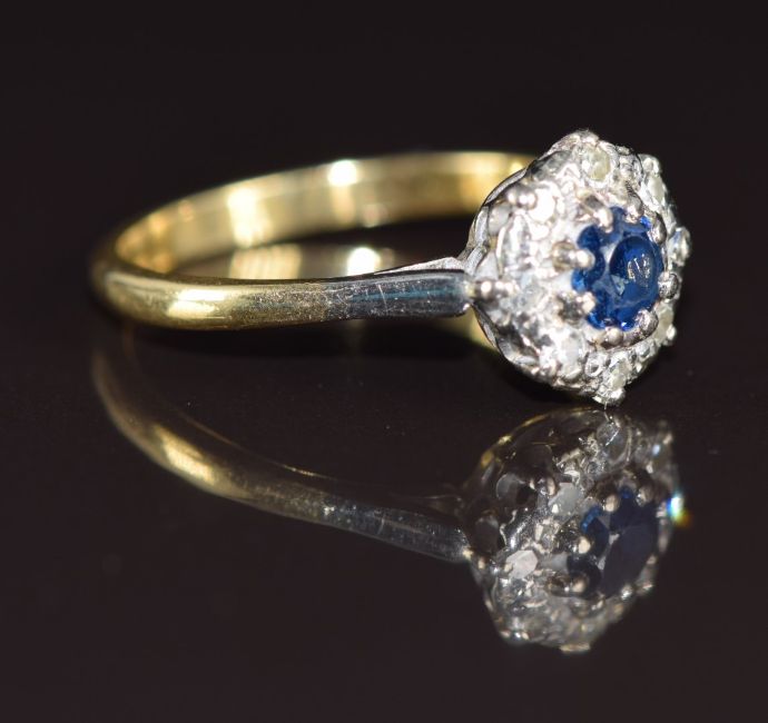 An 18ct gold ring set with a round cut sapphire of approximately 0.4ct surrounded by diamonds in a platinum setting, 3.6g, size Q