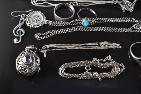 A collection of silver jewellery including three rings, charm bracelet, tri-coloured necklace, ingot, ten chains, six pendants, pair of earrings, brooch in the form of an axe set with agate and a 9ct back and front heart locket