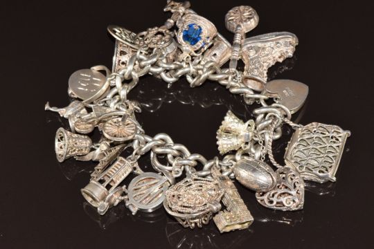 Silver charm bracelet with twenty-two silver charms including purse, clock, lobster pot opening to reveal lobster, etc, 116g