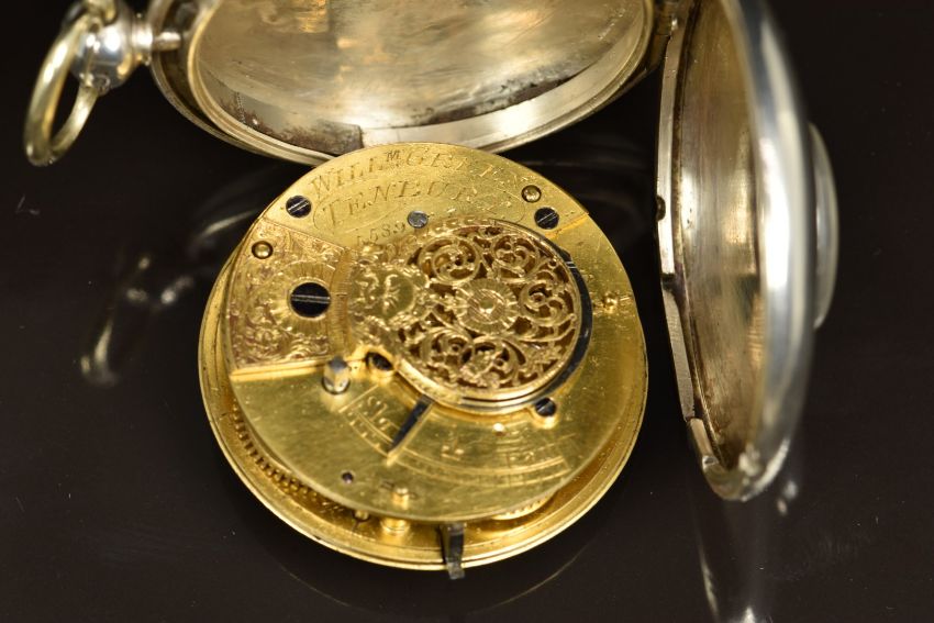 William Green of Tenbury hallmarked silver half hunter pocket watch with gold hands, black Arabic numerals, cream dial, masked and pierced balance cock and signed fusee movement, case diameter 52mm, serial number 5589.