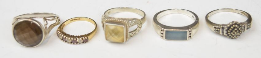 A 9ct gold ring set with amethysts and cubic zirconia (1.7g), silver necklace, earrings and ring set with amethysts and five silver rings